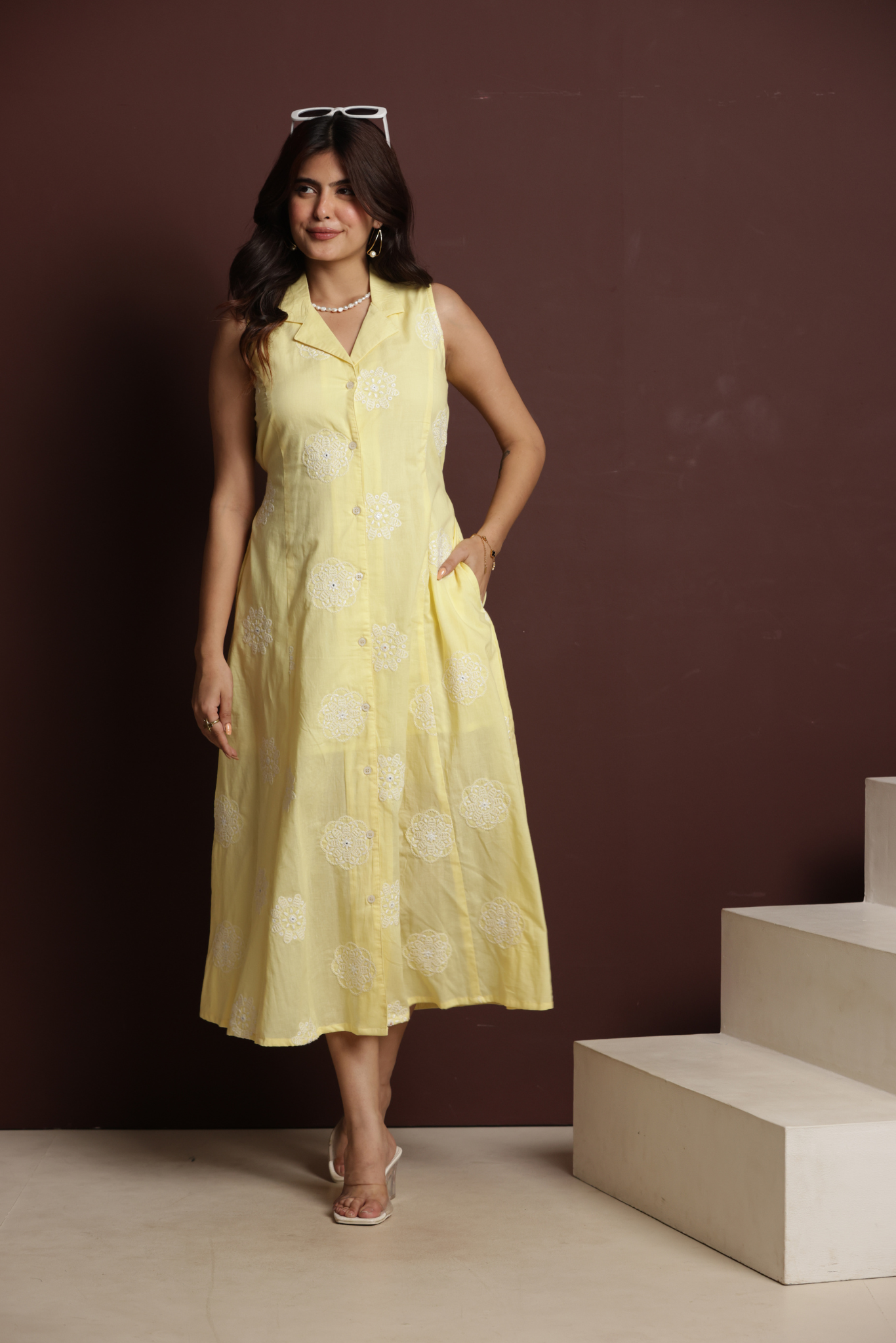 This sleeveless embroidered maxi dress features delicate floral motifs and a button-down front for a breezy, elegant look. Perfect for sunny days, it blends comfort with effortless charm.