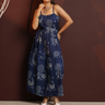 This indigo blue strappy maxi dress features elegant ethnic prints, blending comfort with effortless charm. Its flared silhouette and Breezy fabric make it perfect for casual outings or relaxed festive looks.