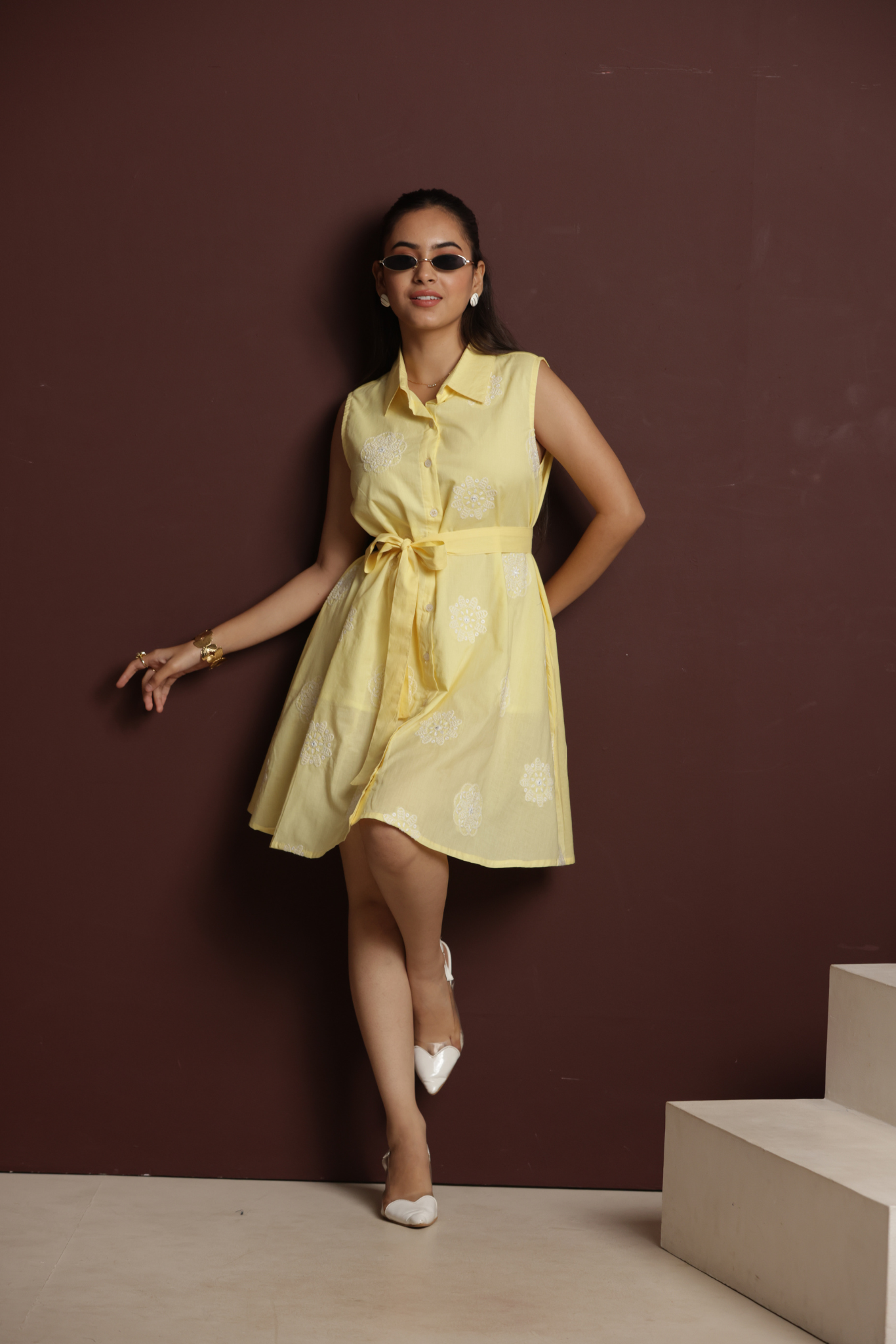 This sleeveless embroidered mini dress features a button-down front and a tie-up belt for a flattering fit. Fresh and playful, it’s perfect for sunny outings and casual chic looks.