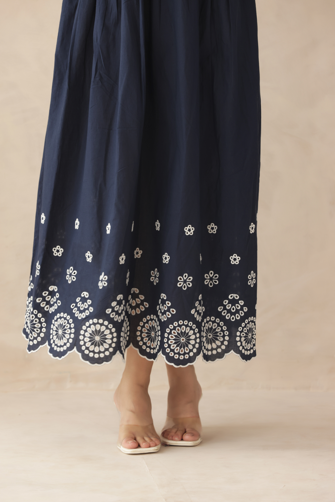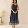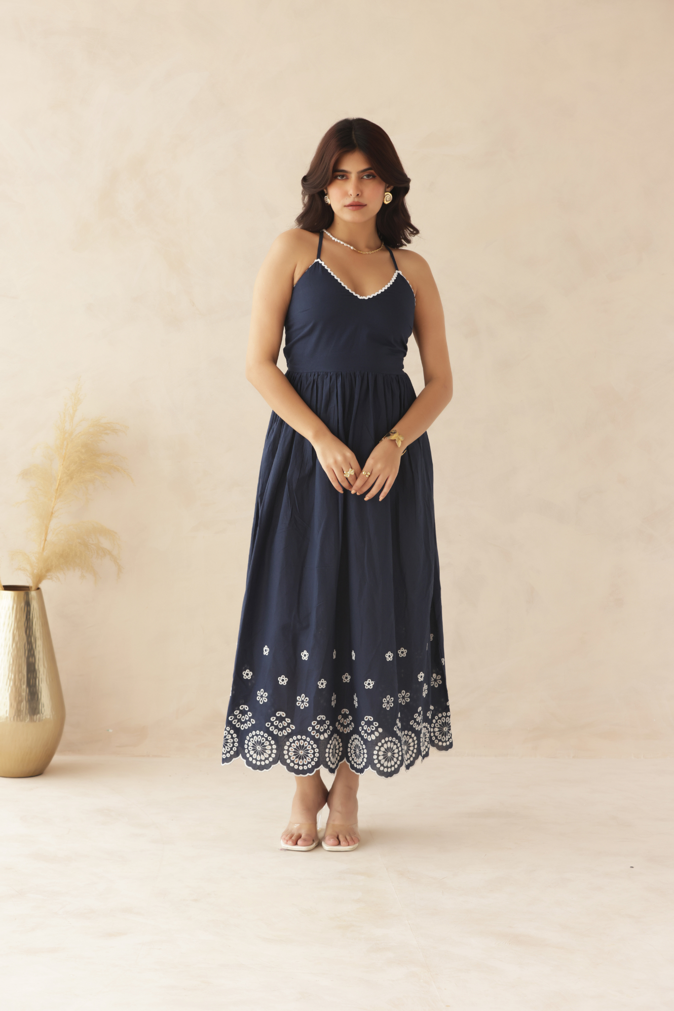 elThis navy embroidered dress features delicate white lace detailing along the hem and neckline, giving it a graceful charm. Its flowy silhouette and strappy design make it perfect for effortless elegance and comfort.