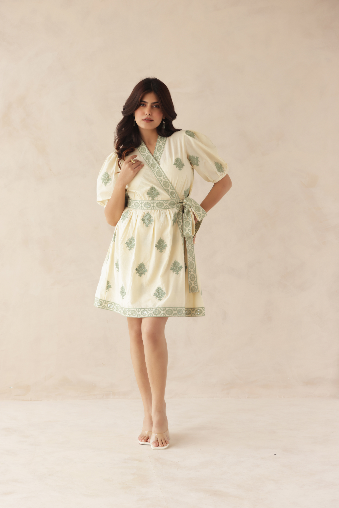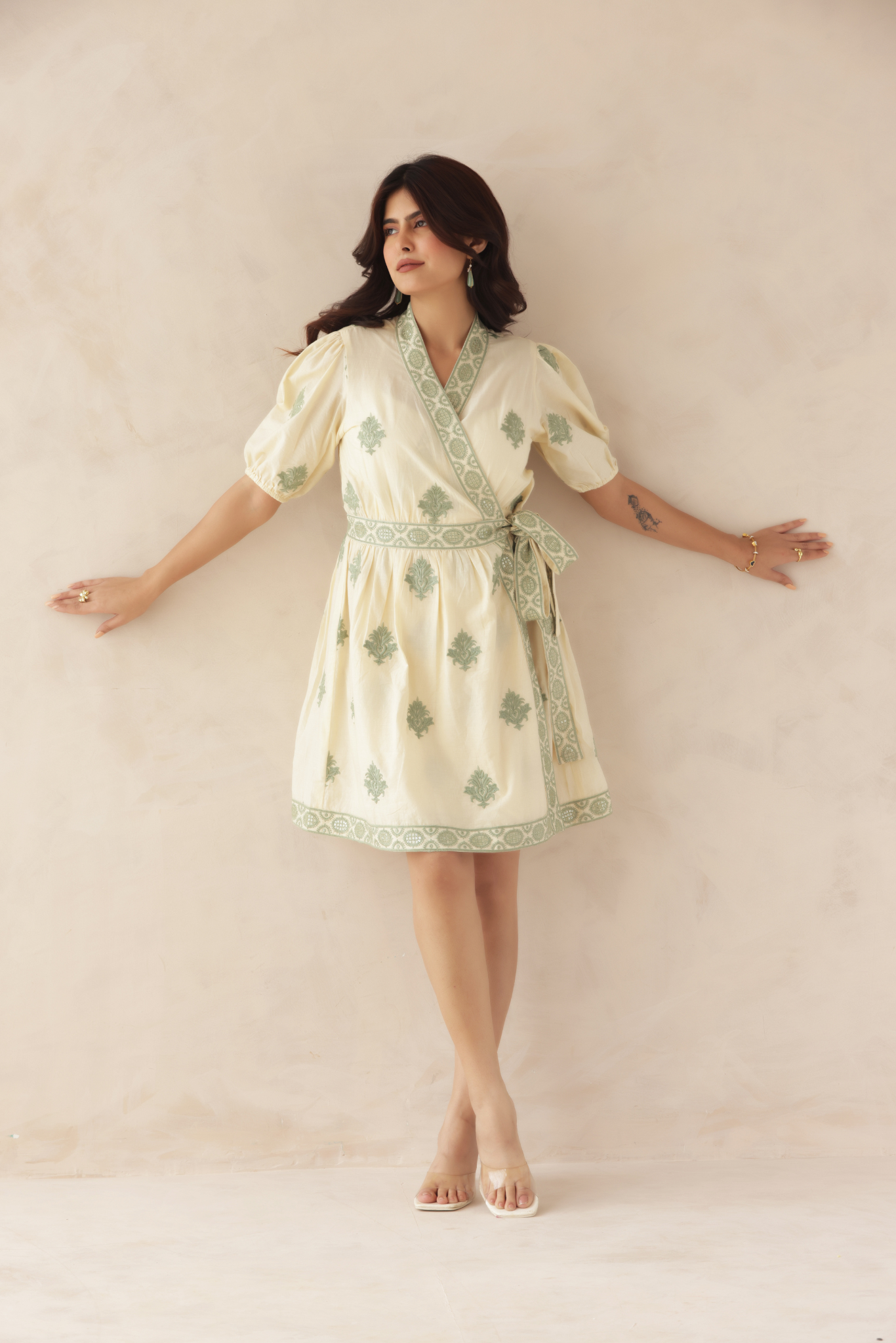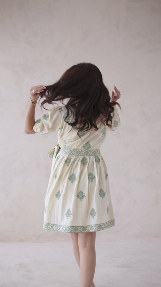 This charming wrap-style mini dress features delicate green embroidery on a soft cream base, creating a fresh and elegant look. The puff sleeves and tie-up waist add a flattering silhouette, perfect for chic daytime outings.