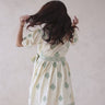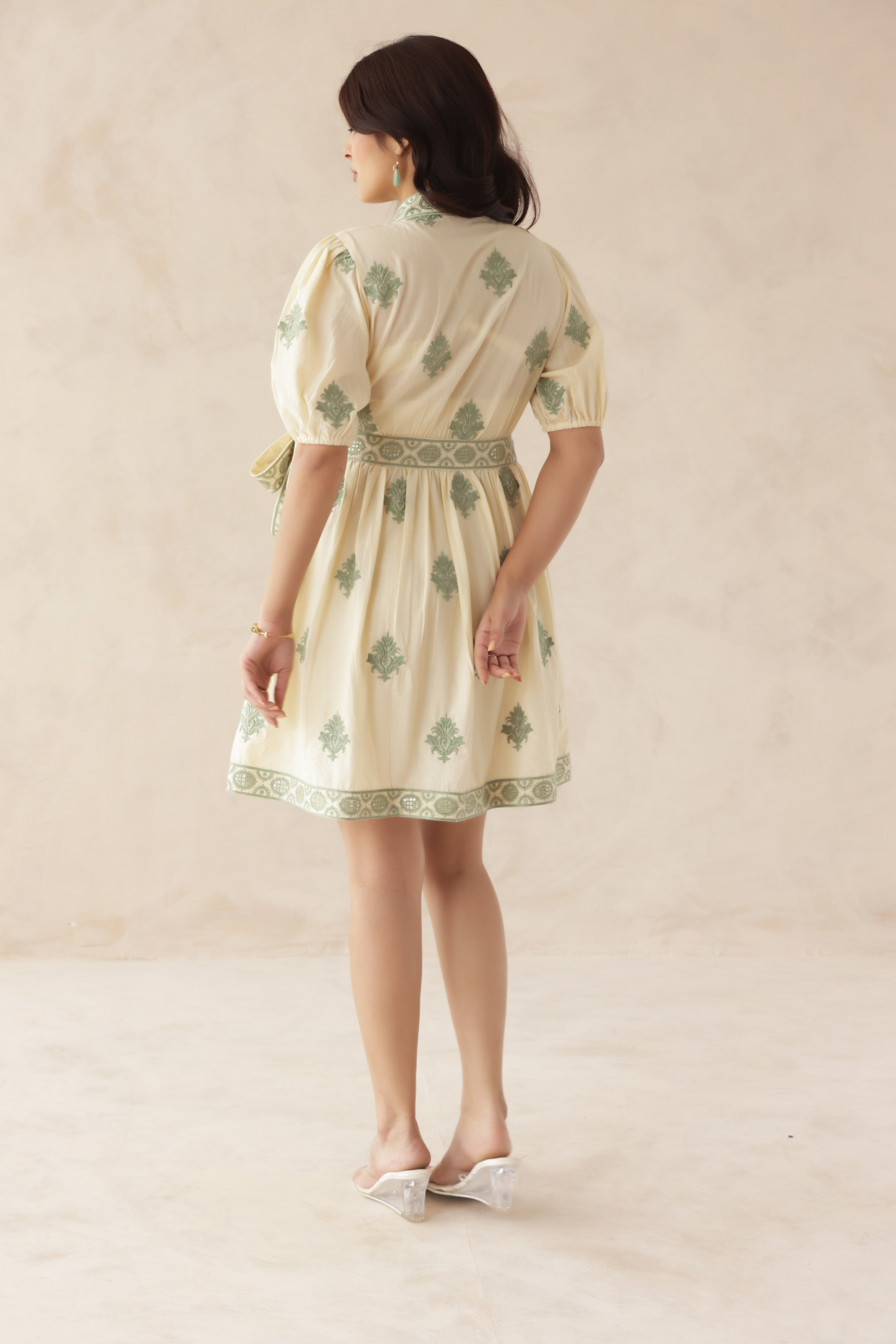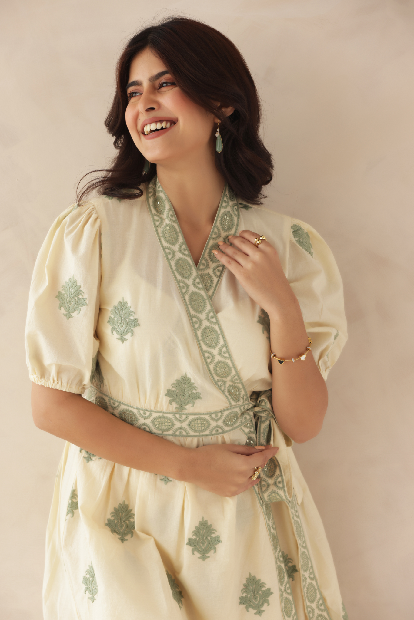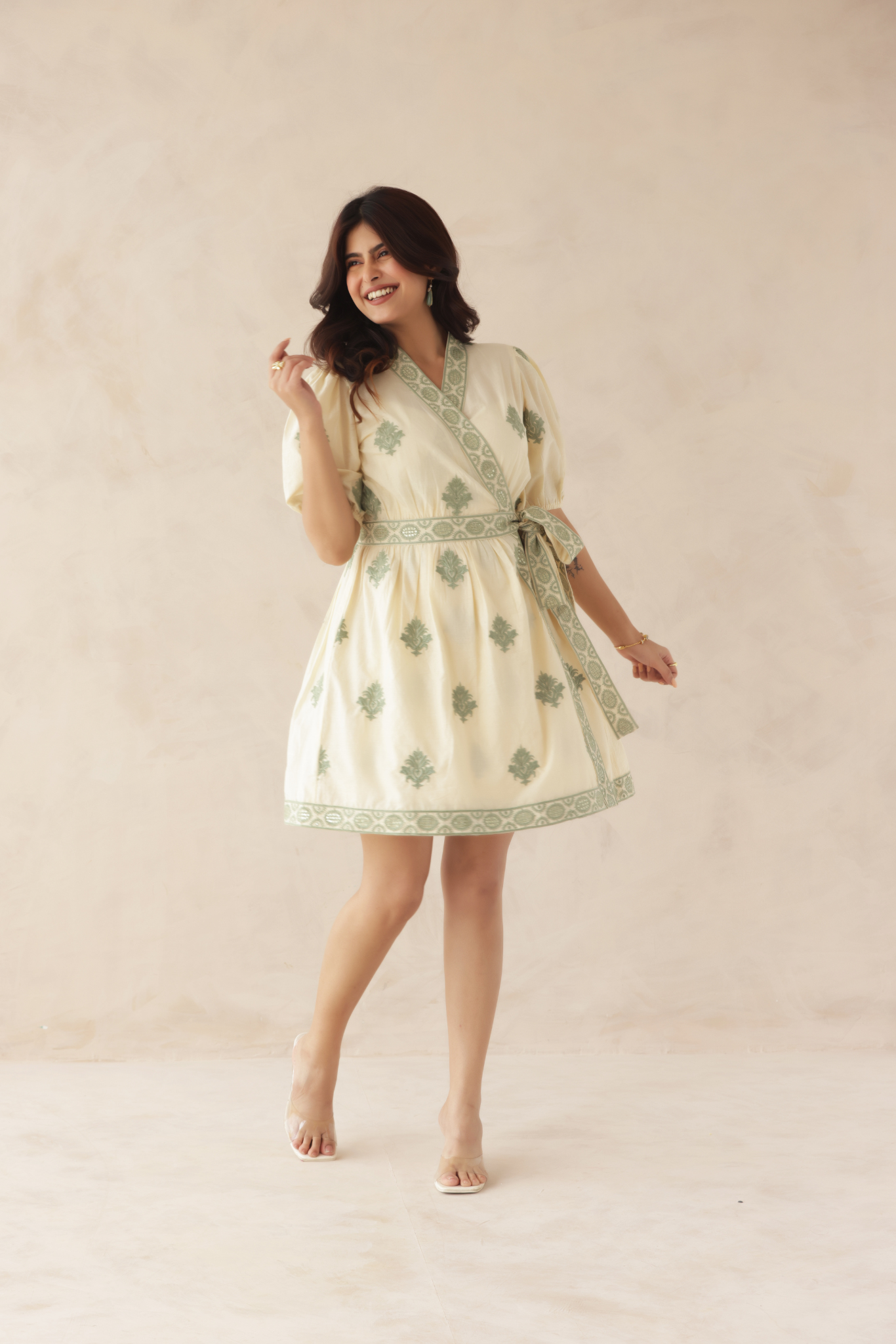 This charming wrap-style mini dress features delicate green embroidery on a soft cream base, creating a fresh and elegant look. The puff sleeves and tie-up waist add a flattering silhouette, perfect for chic daytime outings.