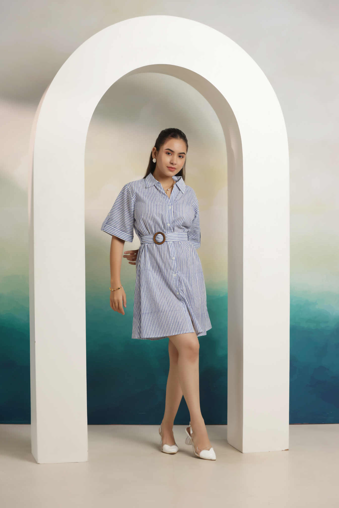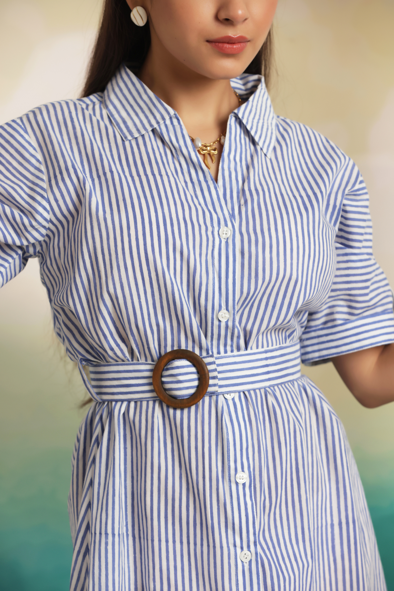 This hand-block printed striped mini shirt dress is a timeless staple with a modern twist. Designed with a crisp collar, button-down front, and half sleeves, it comes with a statement wooden buckle belt that enhances the waistline. The subtle front slit adds just the right touch of ease, making it perfect for both work and weekend plans.
