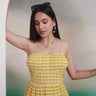 This sunny yellow hand-block printed gingham midi dress features pintex detailing. Crafted in airy cotton, it’s the perfect blend of playful and effortless style for sunny days.