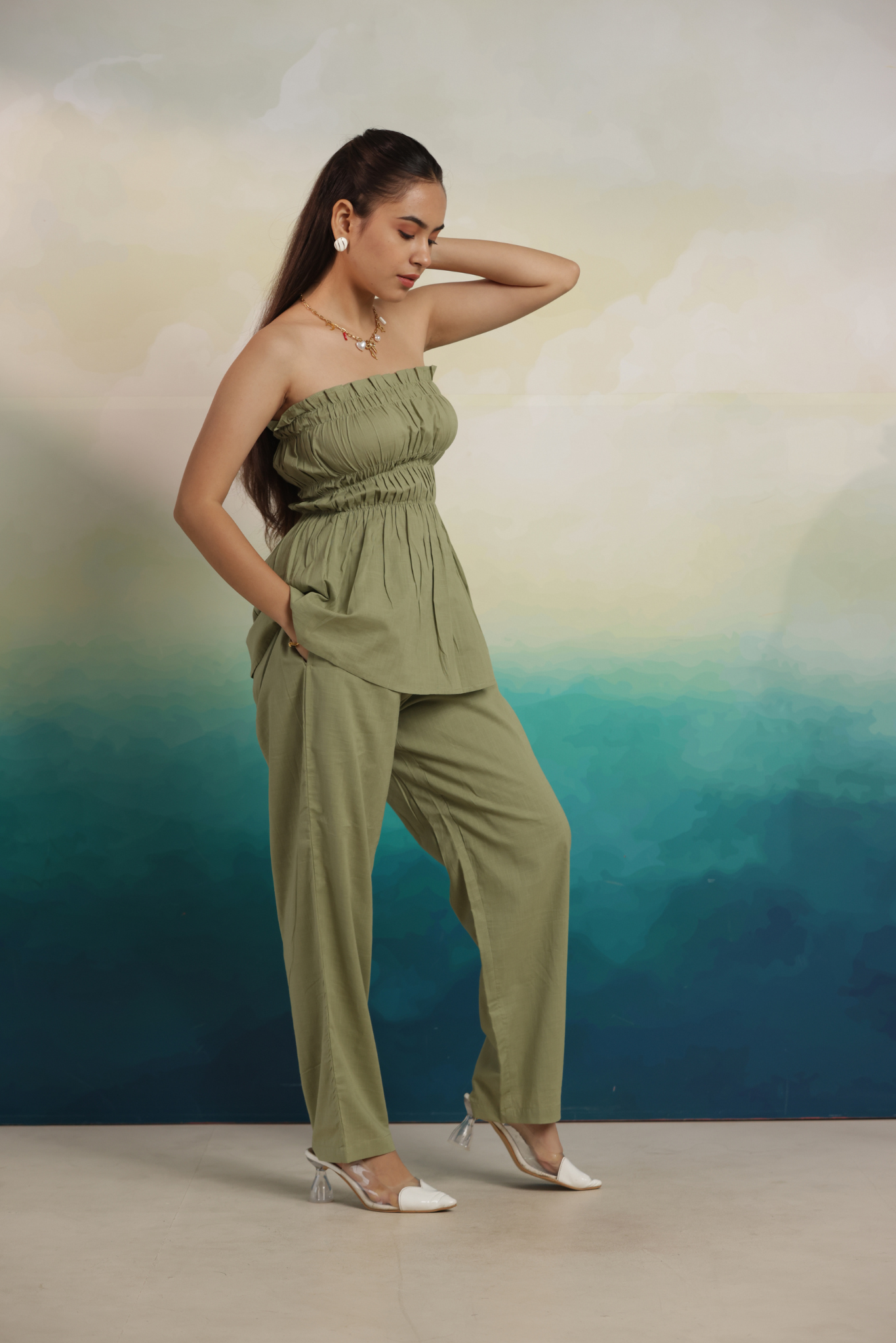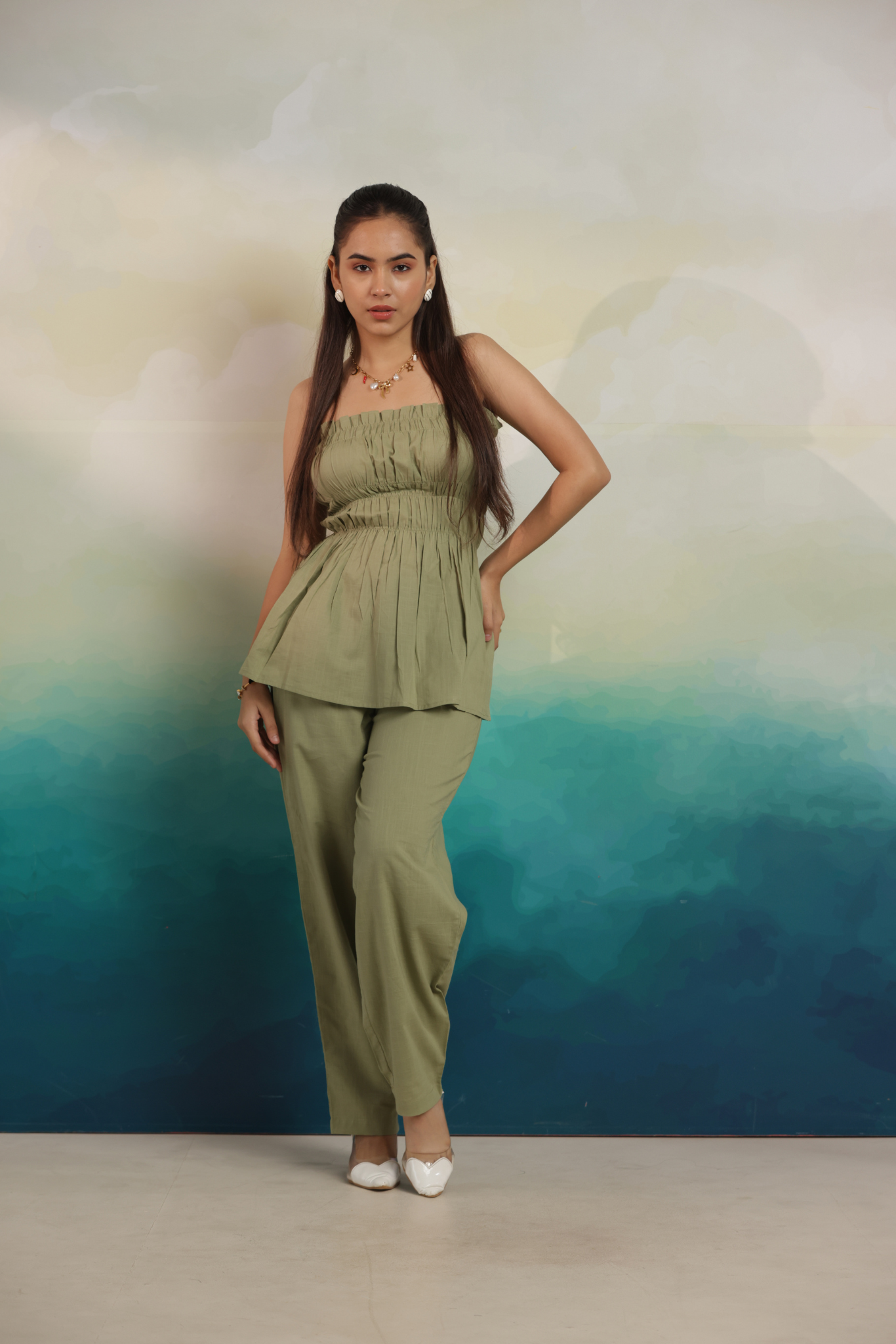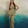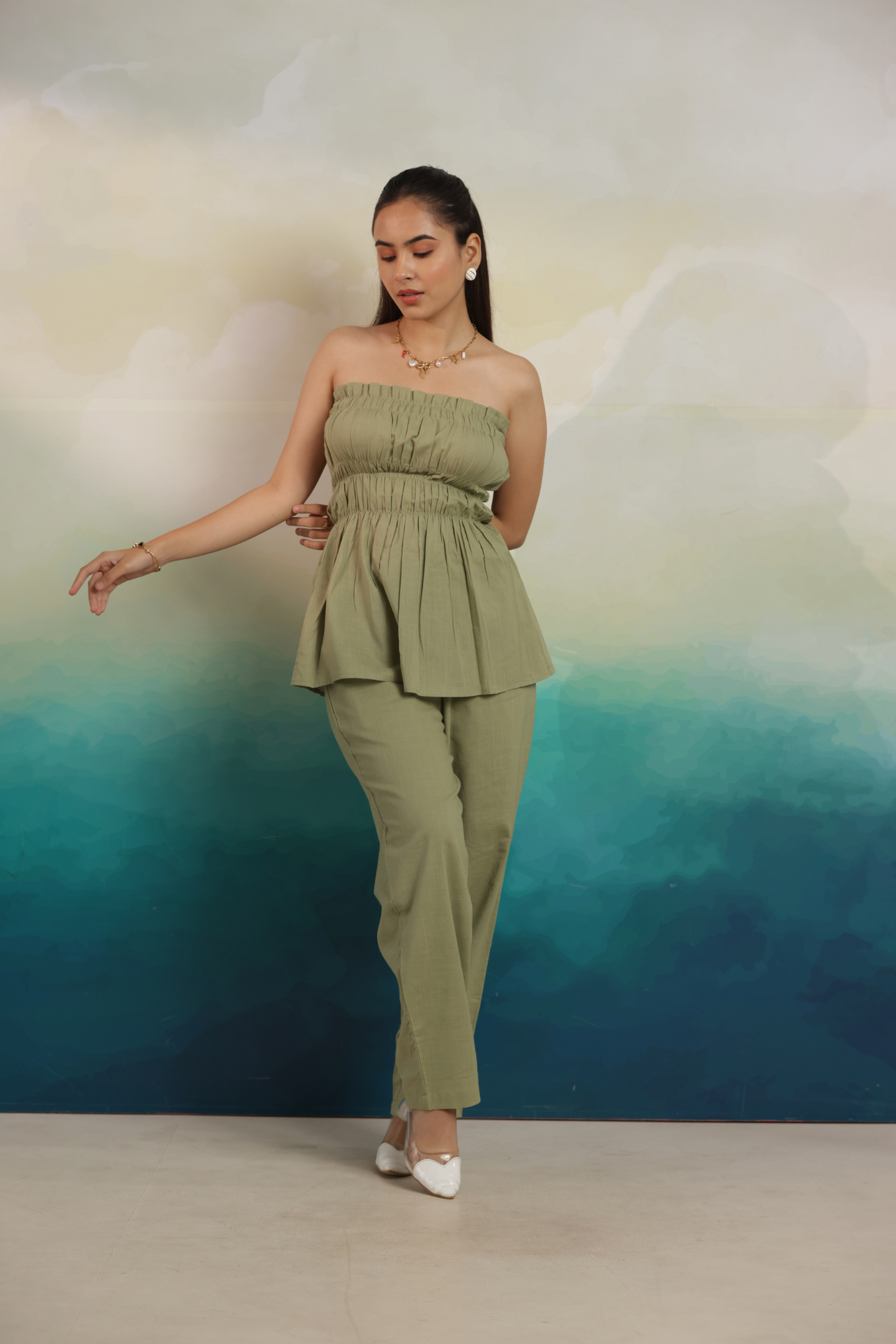 A chic bandeau top with soft gathers paired with relaxed trousers, crafted from breathable cotton for all-day comfort and style.