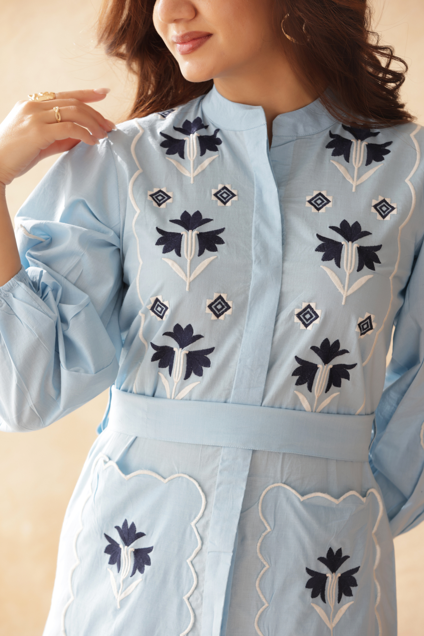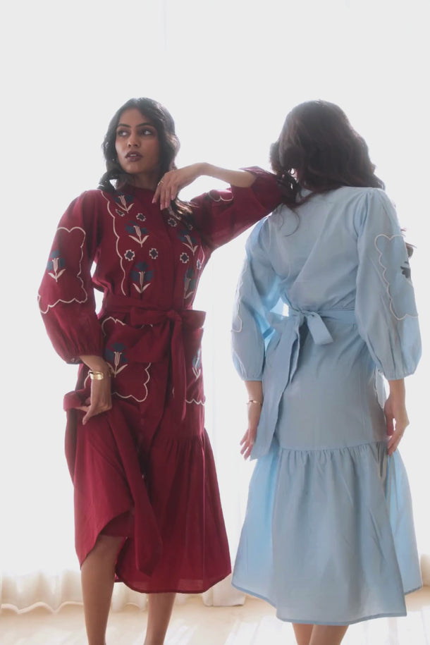 Featuring intricate embroidered motifs on soft cotton, this dress is finished with puffed sleeves, a defined waist, front pockets and a graceful flared hem.