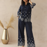 This elegant navy blue cord set, crafted from 100% pure cotton, is adorned with intricate white embroidery for a timeless appeal. Featuring a