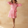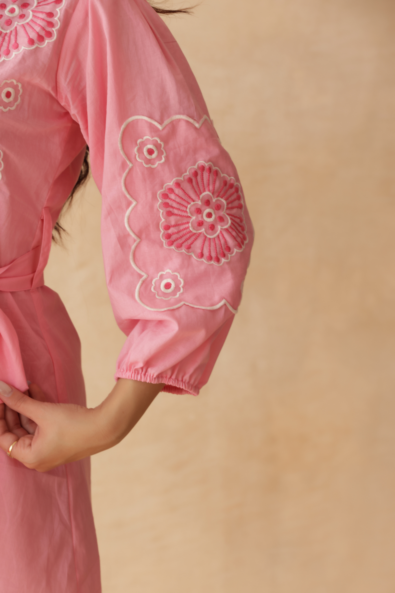 Made from lightweight cotton, this dress features contrast floral embroidery and a clean button-down front. The structured waist belt and relaxed sleeves add balance, making it perfect for easy day-to-evening styling.
