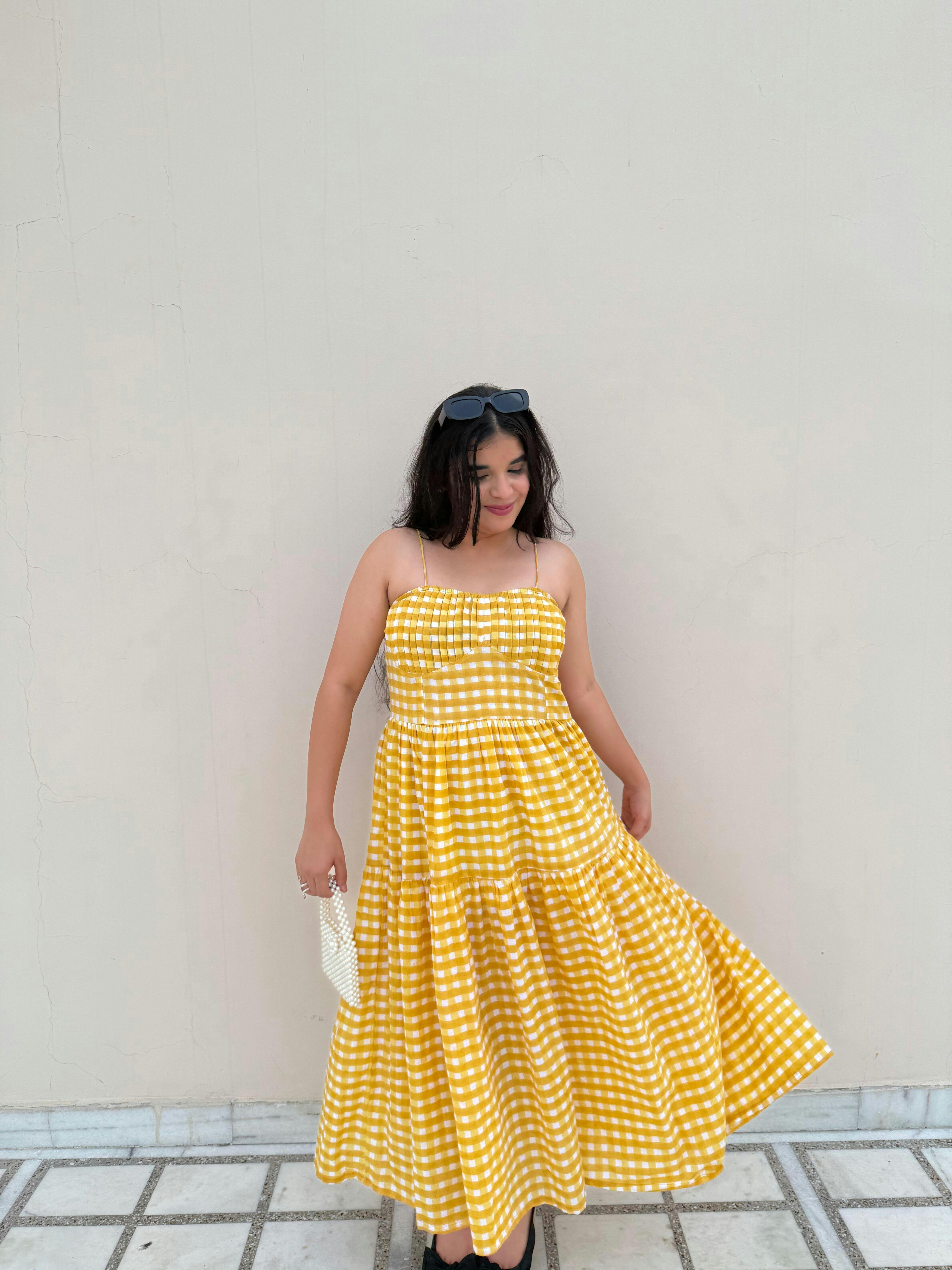This sunny yellow hand block printed gingham midi dress features pintex detailing. Crafted in airy cotton, it’s the perfect blend of playful and effortless style for sunny days.